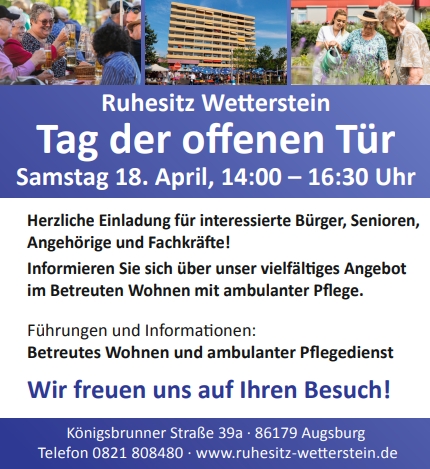 Wohnen wie Zuhause und dabei beste pflegerische Leistungen erhalten. Die Seniorenresidenz Wetterstein in Augsburg stellt Senioren einen Wohn- und Lebensraum zur Verfügung, der deren Bedürfnissen nach Sicherheit, Selbstbestimmung und respektvollem Miteinander in optimaler Weise entspricht.